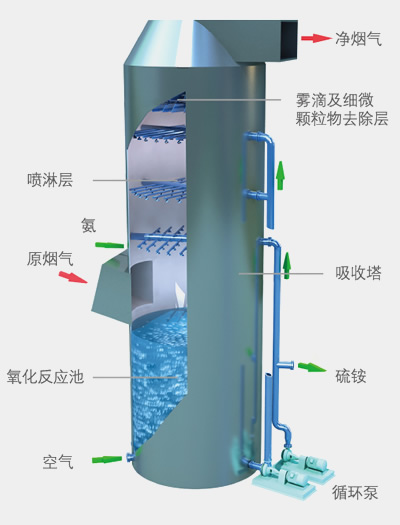 吸收形成的亞硫酸(氫)銨氧化成硫酸銨,硫酸(suān)銨溶液將煙氣溫度降低並蒸發水分,自身濃度(dù)得到進一步提高。