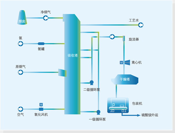 采用飽和結晶工(gōng)藝,吸收係統產生一定固含量的硫酸銨漿液,再進行固液分離(lí)、幹(gàn)燥和包(bāo)裝,產出商品硫酸銨;采用蒸發結(jié)晶工藝,則是設置蒸發結晶係統對吸收係統產生的硫酸銨溶(róng)液進行蒸發結晶,再進行(háng)固液分離、幹燥和包裝,產出商品硫酸銨。
