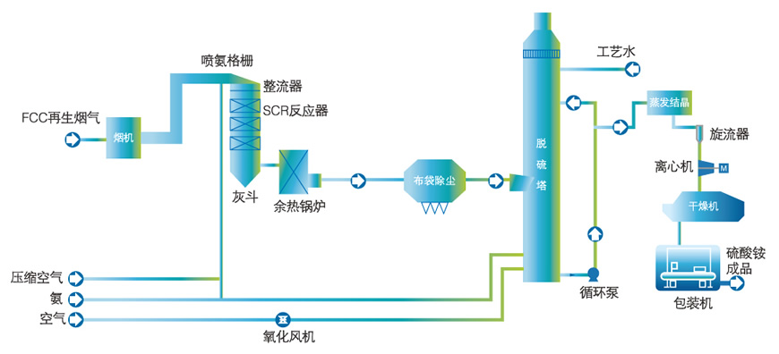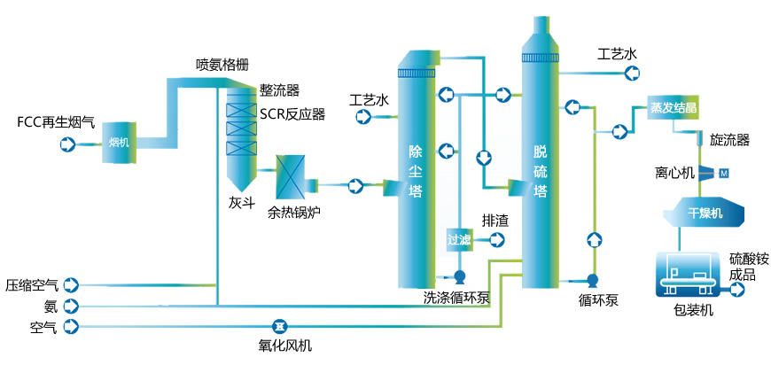 催化裂化的再生煙氣經煙機、高溫鍋爐回收能(néng)量後,在300℃~420℃溫(wēn)度下進入SCR反應器,在催化劑作用下,煙(yān)氣中的NOx與NH3反應生成N2和(hé)H2O;脫(tuō)硝後(hòu)煙(yān)氣經低溫(wēn)鍋爐回收熱量(liàng)後進入布袋除塵器,經布袋除塵後進入脫硫塔,脫硫後的淨煙氣經脫硫塔塔頂直排煙(yān)囪排放。煙氣中的二氧化硫在(zài)脫硫塔內被(bèi)吸收,生成的亞硫酸銨溶液經氧化、濃縮(suō),送入蒸發結晶係統,得到一定固含量的硫酸銨漿液。硫酸銨漿液再經旋(xuán)流器、離心機、幹燥機後,得(dé)到(dào)水分<1%的硫酸銨(ǎn),再進入包裝機包裝,得到產(chǎn)品硫酸銨。工藝過程無廢水排放。